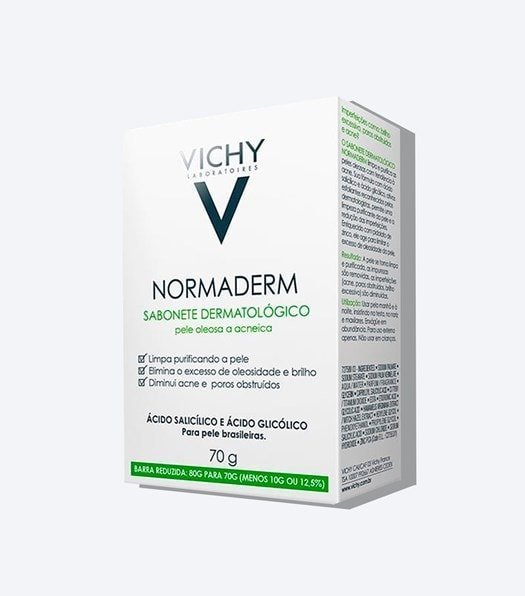 O sabonete Vichy Normaderm em barra é essencial para uma limpeza profunda da pele oleosa ou acneica.